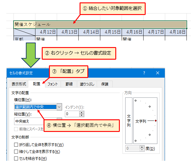 書式設定から選択範囲内で中央