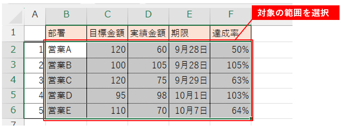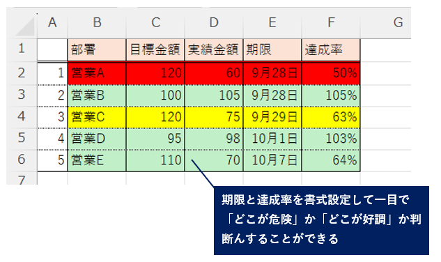 条件として「期限切れかつ目標未達成なら赤」、「期限が残り2日かつ目標未達成なら黄」、「目標達成なら緑」とします!