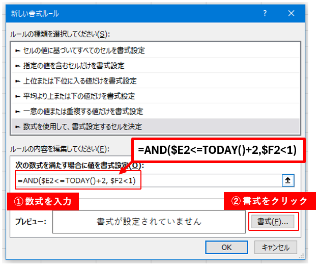 数式欄には「=AND($E2<=TODAY()+2,$F2<1)」と書きます