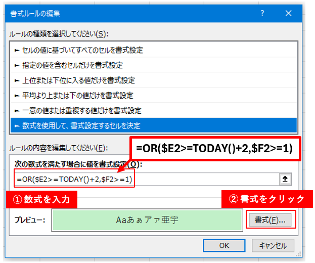 数式欄に「=OR($E2>=TODAY()+2,$F2>=1)」と書きます