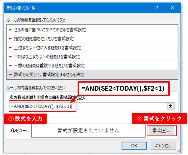 最後の数式は「=AND($E2<TODAY(),$F2<1)」と書きます