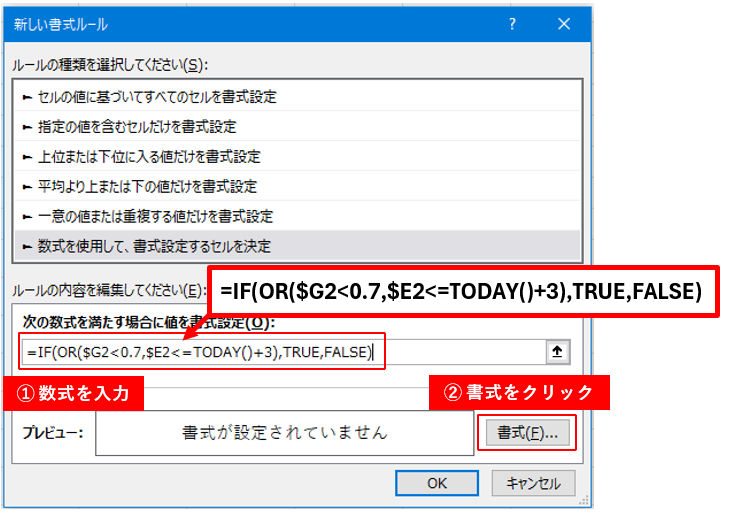数式欄に「=IF(OR($G2<0.7,$E2<=TODAY()+3),TRUE,FALSE)」と書きます