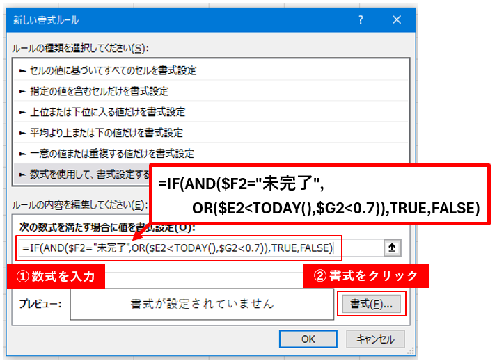 数式欄に「=IF(AND($F2=”未完了”,OR($E2<TODAY(),$G2<0.7)),TRUE,FALSE)」と書きます