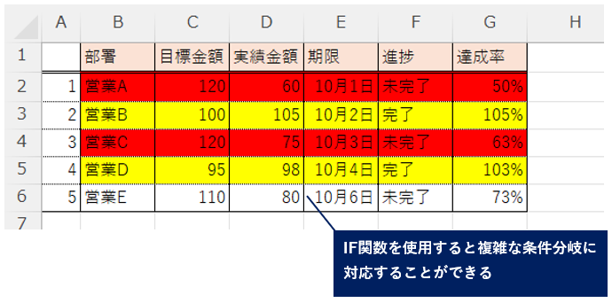 単純な条件やと限界あるなぁ。例えば“未完了タスクで期限切れ かつ 達成率が低い”とか、“売上が目標未達 または 期限オーバー”とか…