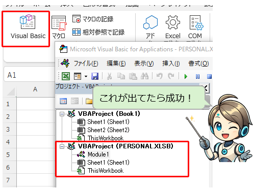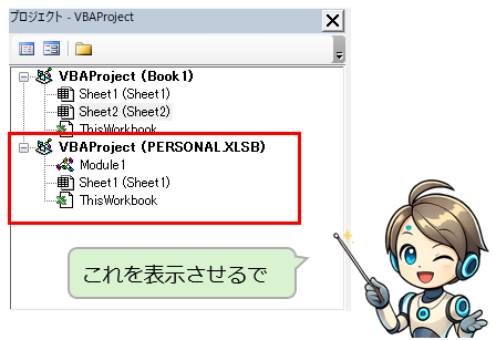 「開発」タブの「Visual Basic」を押してみると、VBAProject(PERSONAL.XLSB)が表示されてるはずや