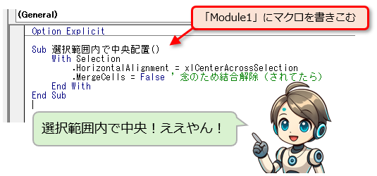 せやろ。この「Module1」にタスクが作ってきたマクロを書きこんでいくだけや