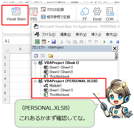 「開発」タブからVBEを開いて個人用マクロブック(PERSONAL.XLSB)が無ければ【準備編】から進めてな!
