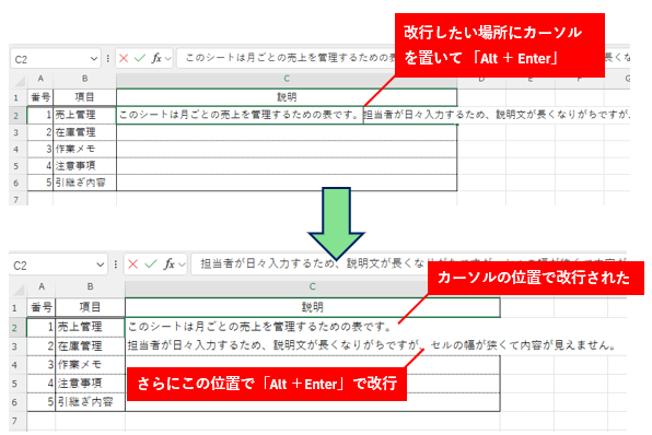 | Enterで改行 | 下のセルへ移動 | Alt+Enter |