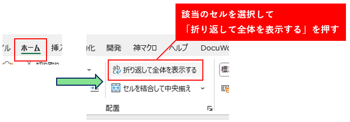 「ホーム」タブ → 「折り返して全体を表示する」を押してみましょう