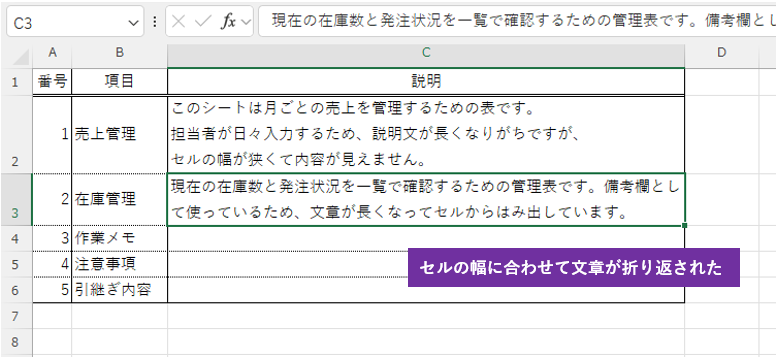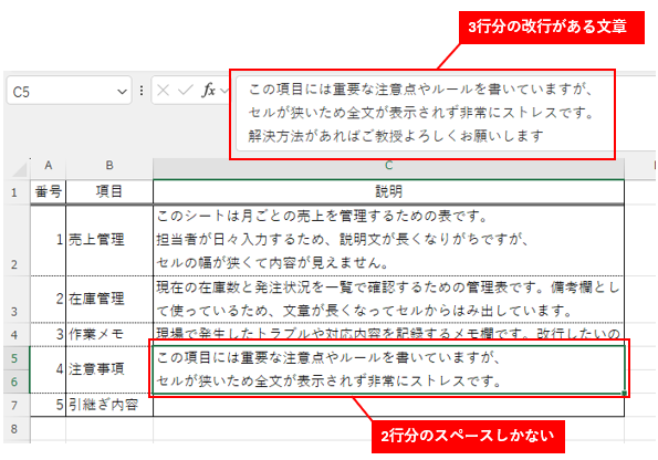 たとえばこんな感じに、5行と6行が結合された状態で説明文が3つに改行されていたとします