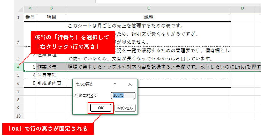 🩹ステップ③:行の高さが固定されてないか確認