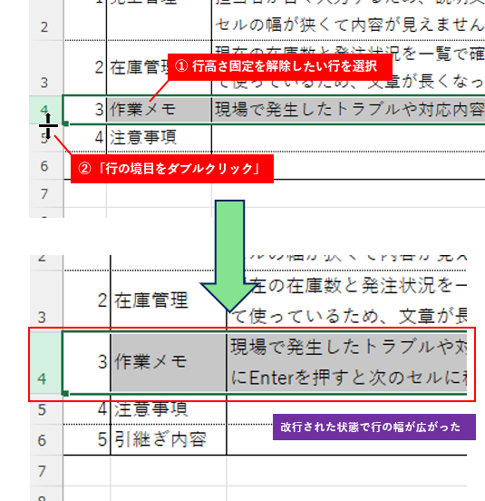 結合されている行は「行の境目をダブルクリック」しても「行の高さを自動調整」しても反応してくれへん