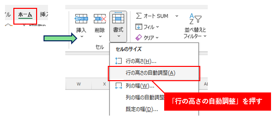 「ホーム」タブから「書式→行の高さの自動調整」を押すと