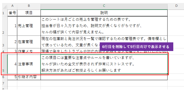 このような場合、6行目をマウスで下に引っぱって結合セルを広げる方法もありますが、行の高さが揃わなくなったり表の形が崩れたりとトラブルの原因になりますので6行目を削除してしまいましょう