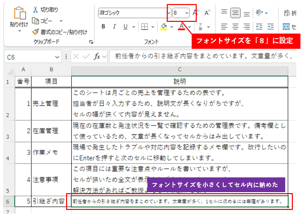 まずはフォントサイズを手動で調整してセル内に納まるようにしてみましょう