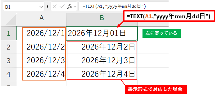 図で見ていただいたらわかる通り、2026/12/1だけセルの中で左に寄っていますね。