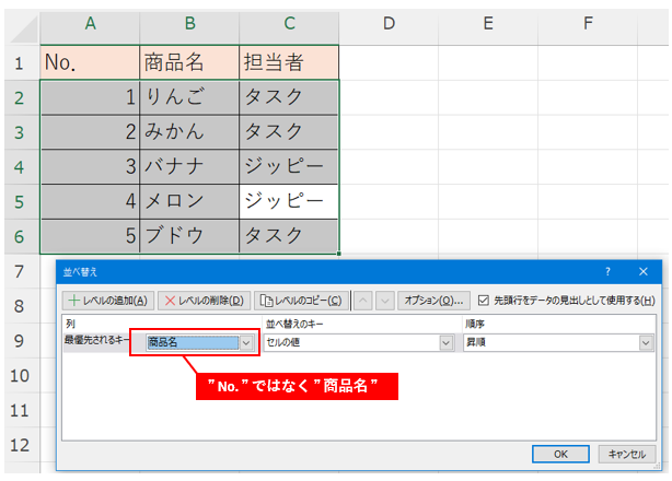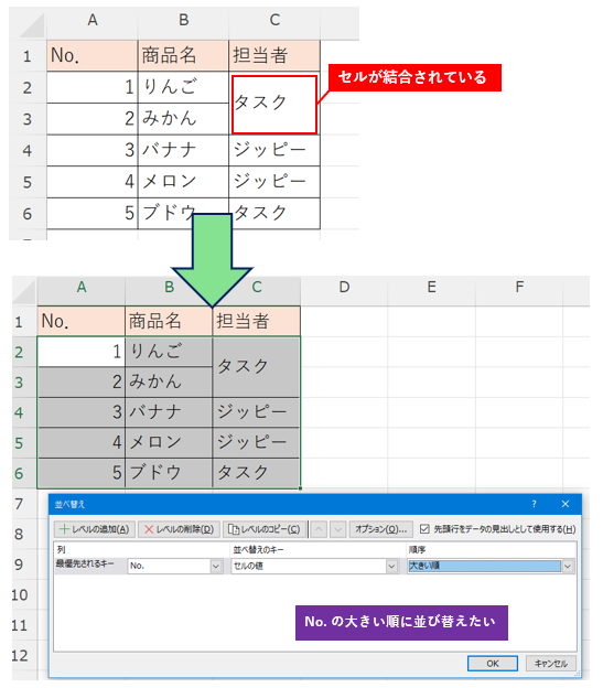 この状態で ” A列 ” のNo.を大きい順に並べ替えようとしても・・・