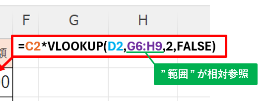 この表の問題点は ” E列 ” に入っているVLOOKUP関数の範囲が相対参照であることですね!