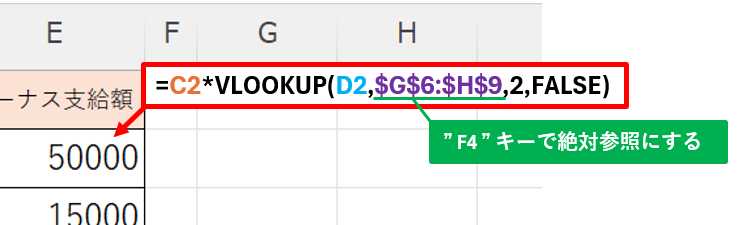 ” C列 ” の売上に対して評価をつけてボーナス支給額を決定している表です。