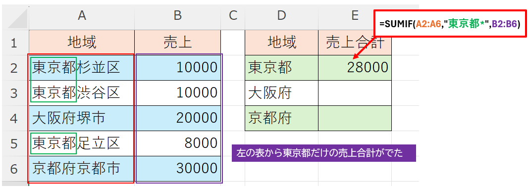 =SUMIF(A2:A6,”東京都*”,B2:B6)