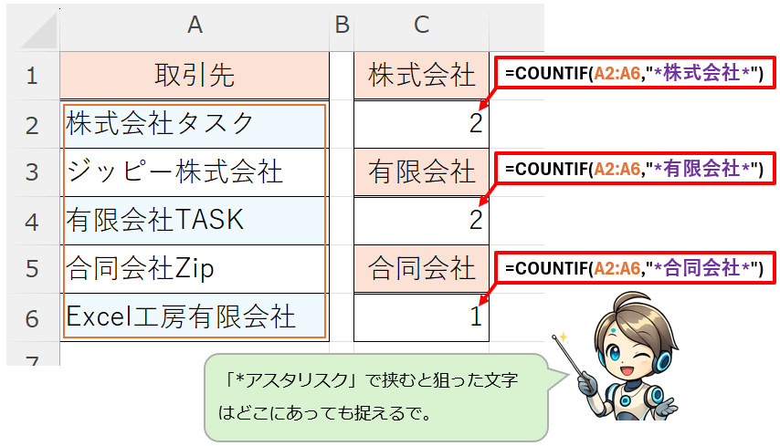使うのはこれ👉 =COUNTIF(A2:A100,”*株式会社*”)