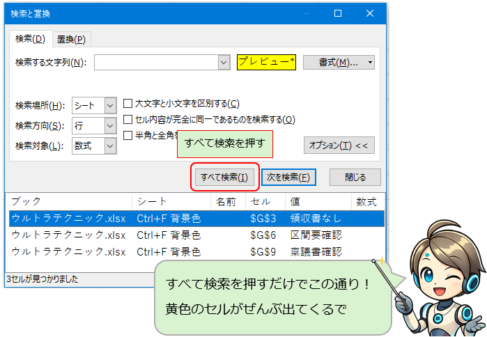 あとは、すべて検索を押すと選んだ背景色のセルがすべて一覧になって表示されるで!