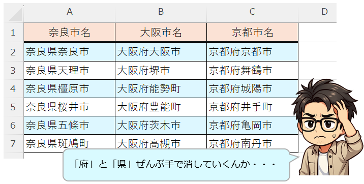 「○○府」をふっ飛ばすには「 *府 」に書き換えて全て置換な!