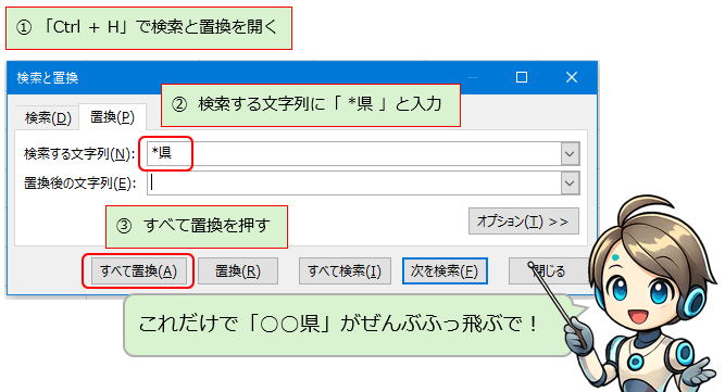 Ctrl + H(置換) - 検索する文字列に「 *県 」と入力