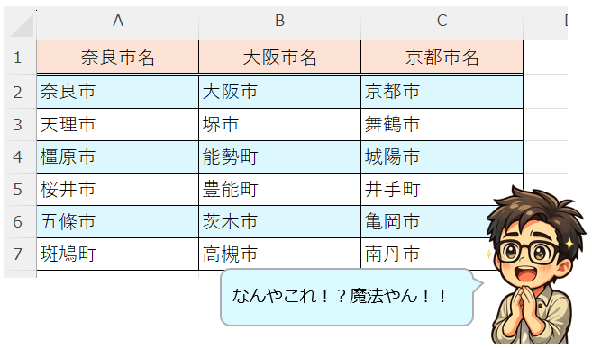 「大阪府大阪市」「京都府京都市」「奈良県奈良市」って並んでるんやけど、