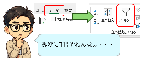 普通は「 データ 」タブをクリックして「 フィルター 」をクリックやもんな。