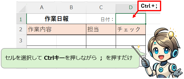 Ctrl + ; を押すと、その日の日付を一瞬でセルに入力できるで。